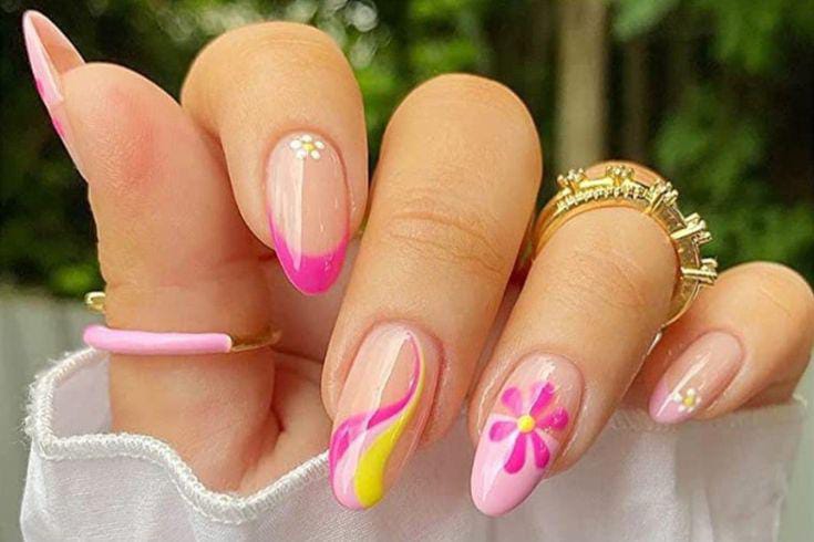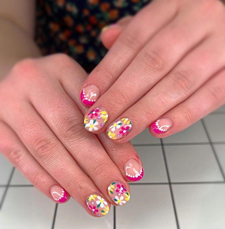 These sheer natural base and bright pink tips paired with multicolored flowers and dots give this look a sweet and cheerful charm. The overall style feels cute and decorative, like a floral candy theme that works beautifully for a playful summer manicure.