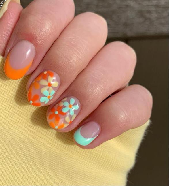 Soft nude nails are paired with orange and aqua French tips and floral accents for a fresh, retro-summer look. The pastel touches balance the brightness, making the design feel cute and light.