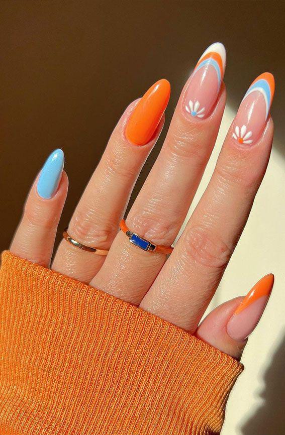 This look mixes bold orange and soft blue shades with curved French tips and delicate daisy details. The nude and solid color contrast feels energetic yet clean, giving a modern twist to cute summer nails.