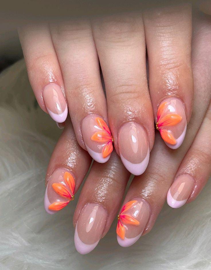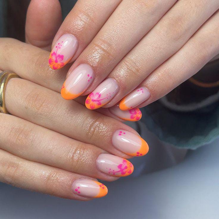 These nails feature coral-orange French tips combined with pink floral accents for a warm tropical appearance. The soft natural base keeps the design elegant while the flowers add a lively summer charm.