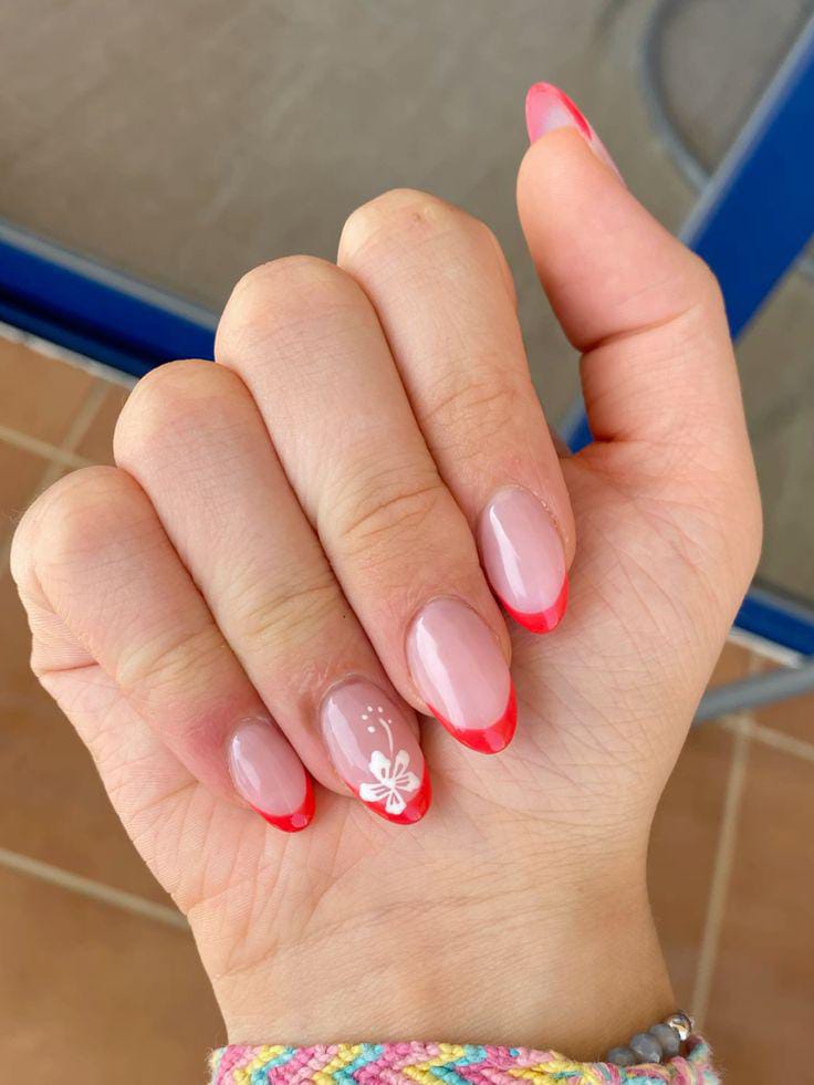 A soft nude base is paired with vivid red French tips that feel bold yet simple. The tiny floral detail adds a cute, youthful touch, making the design look fresh and cute for summer days.