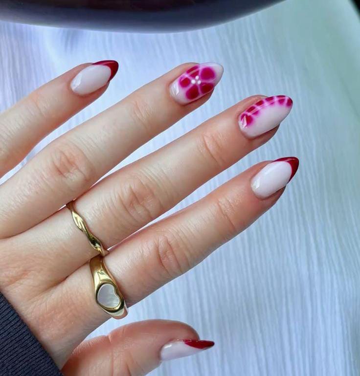 These nails feature deep berry-red French edges with a soft milky white base and dreamy floral and dots accents. The style feels slightly modern and artsy, mixing elegance with a cute summer twist.