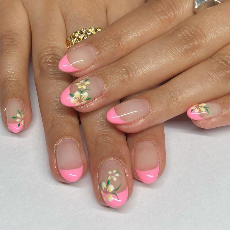 Soft natural base and pink French tips combine with delicate floral and green leaf patterns for a gentle, romantic vibe. The design looks light, cheerful, and perfect for a cute, everyday summer manicure.