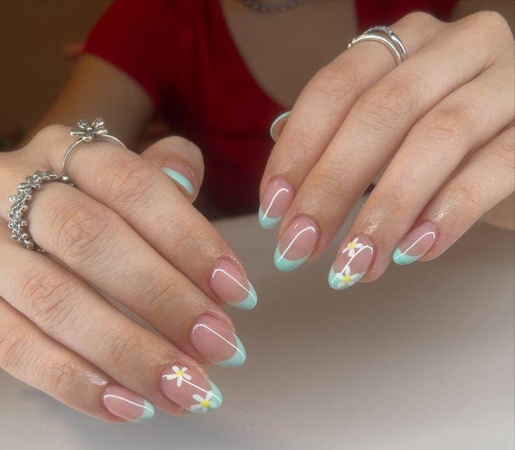 A light and minimal French tip style featuring soft mint edges and tiny daisy details on glossy sheer nude base. The overall vibe is clean, airy, and elegant, perfect for a subtle yet cute summer manicure.