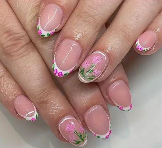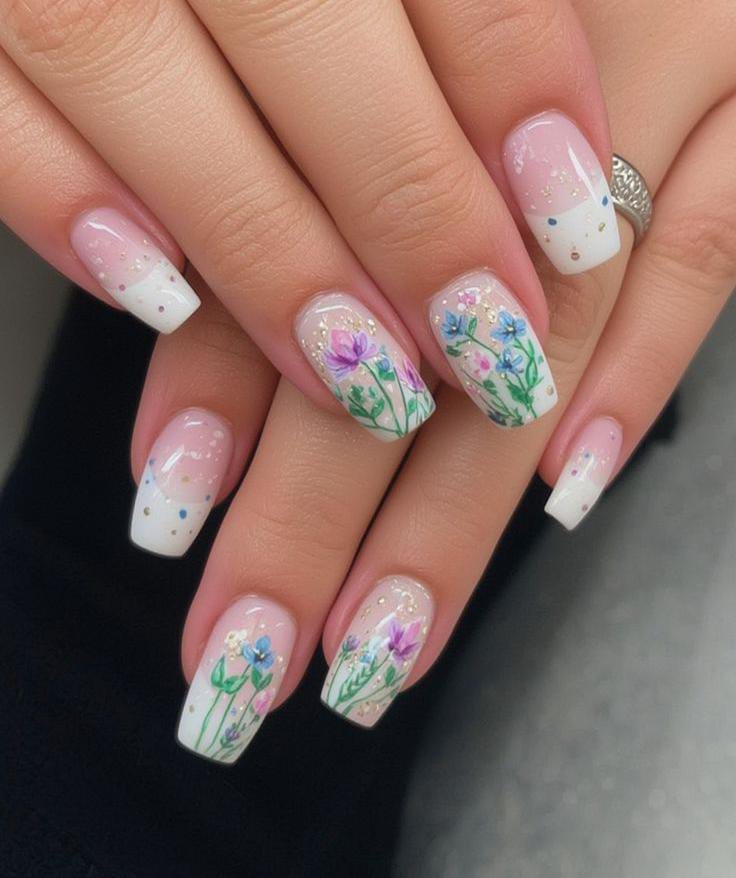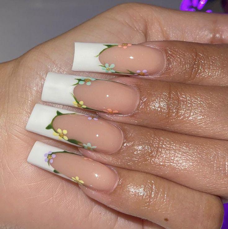A classic white square French tip is paired with delicate colorful floral nude accents and subtle green stems. It feels fresh and floral, like a mini summer garden blooming on your nails.
