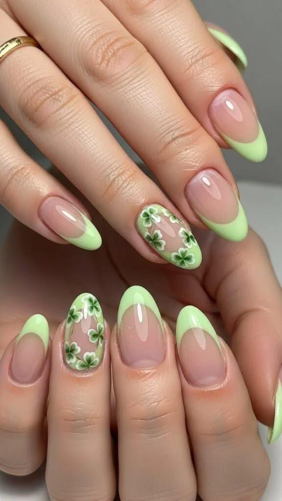Soft nude nails and clean white French tip style is paired with playful green clover accent nails for a fresh seasonal twist. It feels simple, cheerful, and balanced — a classic manicure with a cute, lucky summer charm vibe.
