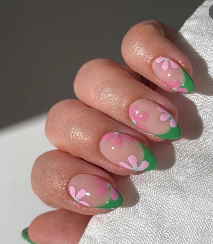 Soft natural base and bold green French tips paired with oversized pink floral shapes create a fun and modern summer style. The look is cute and energetic, blending minimalism with a playful artistic touch.