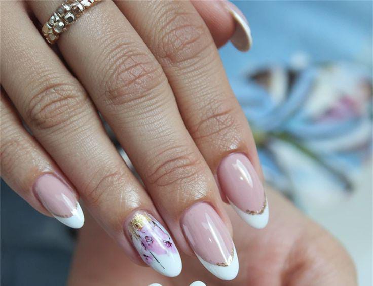 This design features soft pink nude nails with crisp white French tips for a clean summer look. A delicate floral accent with subtle gold detailing adds a romantic and cute touch.