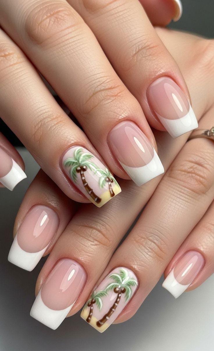 Classic square white French tips get a fun summer upgrade with hand-painted palm trees on accent nails. The soft nude base keeps it balanced while the tropical art adds a beachy, vacation-ready feel. It’s playful, cute, and ideal for summer getaways.