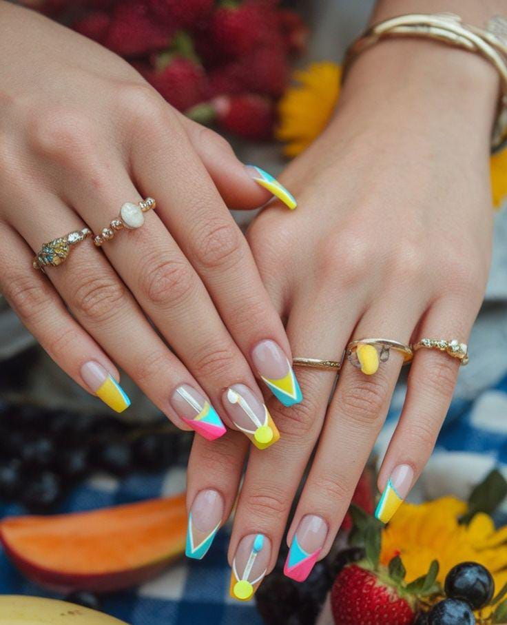 This colorful design mixes bold neon yellow, pink, and turquoise French tips with modern geometric accents. The nude base keeps it trendy while the bright shades bring a fun, energetic vibe. It’s youthful, eye-catching, and perfect for summer festivals.