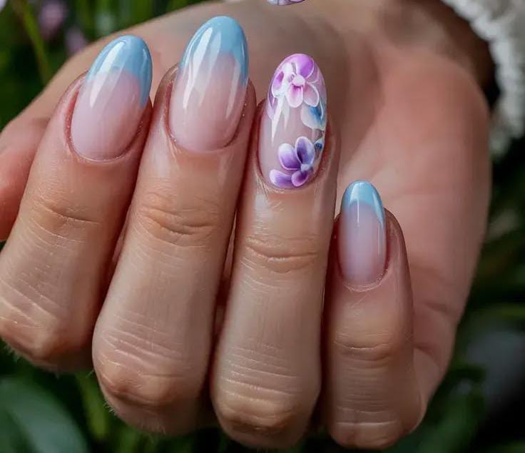Soft blue fades into a sheer pink base, creating a dreamy ombré French tip effect. A bold-style floral accent nail enhances the delicate and airy feel. The overall look is sweet, fresh, and effortlessly pretty for a warm summer.