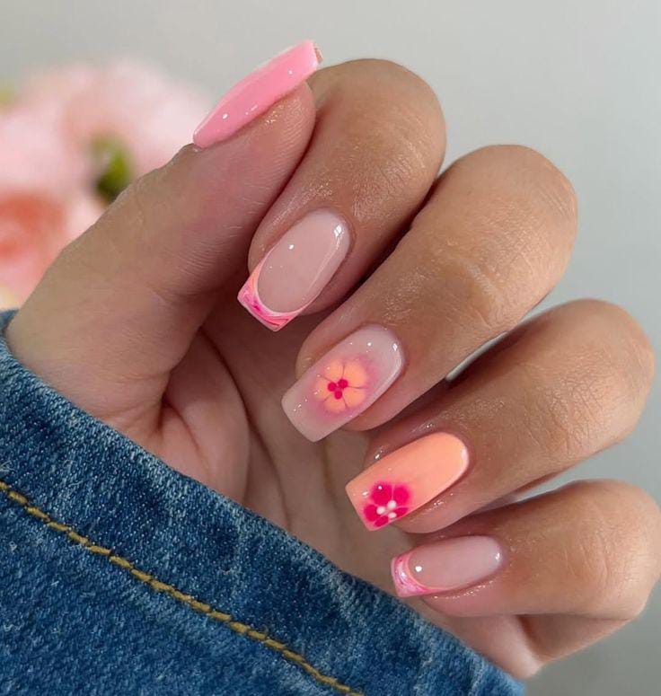 This set blends warm pink and peach tip nails with soft floral touches for a sweet sunset-inspired look. The colors feel youthful and relaxed, giving a soft, cute summer aesthetic.