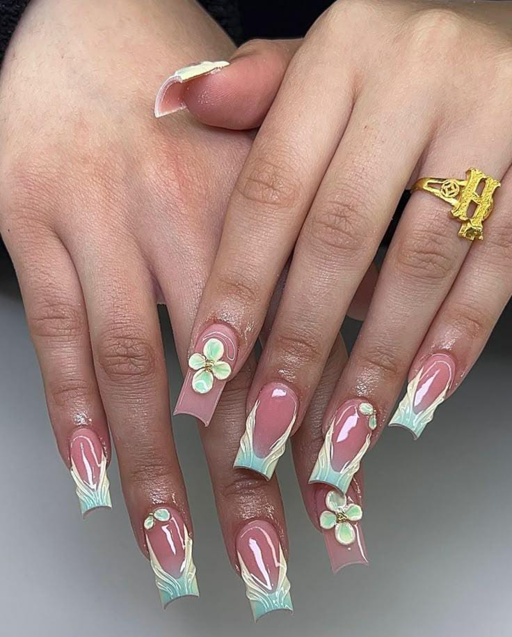 These long square nails feature a glossy nude base with flowing mint and cream yellow French tip swirls. Raised floral and gold studs accents add dimension and a trendy Y2K-inspired touch. The vibe is bold yet cute, combining playful summer colors.