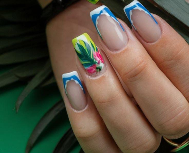 This design features bold blue and white French tips with a soft nude base and subtle wavy detailing along the smile line. One accent nail showcases a vibrant tropical leaf and pink floral art, giving it a fresh, beachy summer vibe.