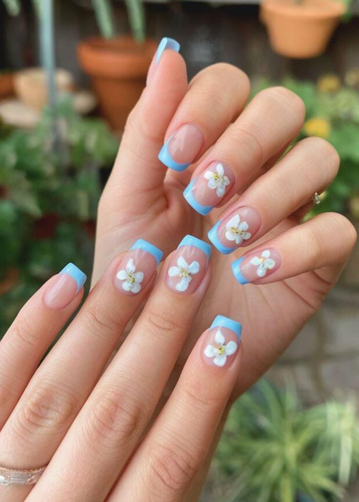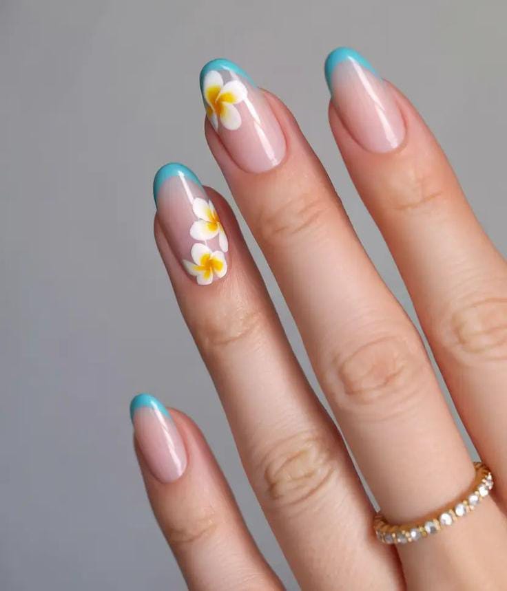 Soft blue French tips are combined with white and yellow tropical-style flowers on a sheer pink base. The look is clean yet summery, with a calm beachy vibe.