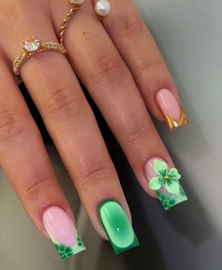 This set mixes glossy green ombré and crisp green French tips with soft pink nude gold nails for contrast. A 3D floral accent adds a bold, summer garden-inspired touch, making the overall look vibrant and eye-catching.
