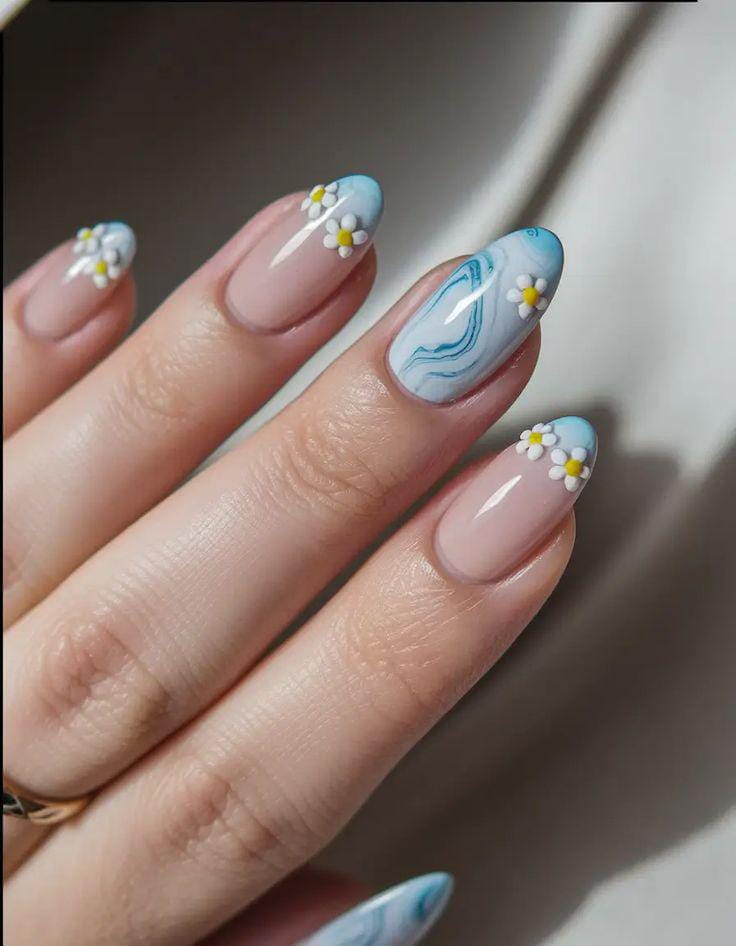 Featuring pastel blue tips and subtle marble swirl details, this design feels soft and dreamy. Tiny 3d daisy accents add a charming summer touch, creating a balanced mix of elegance and fun.