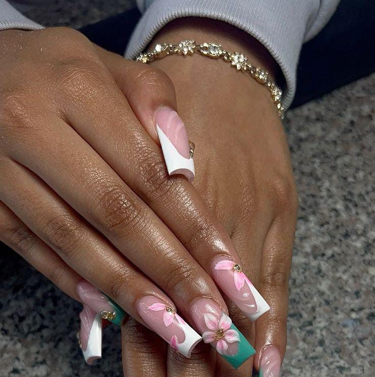This look combines classic white French tips with soft pink raised floral designs and a hint of teal for contrast. The added gems and sculpted details give it a glamorous yet cute summer feel.