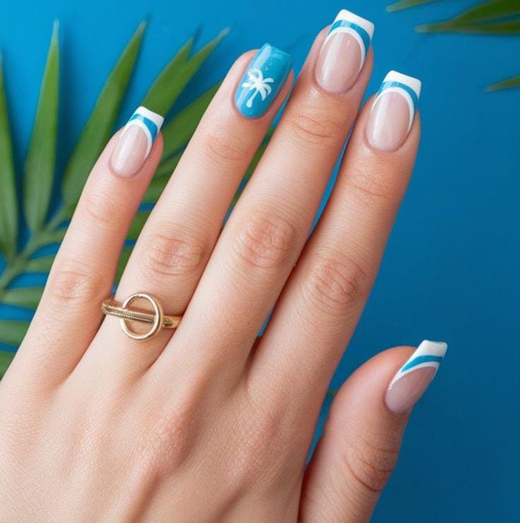 This natural base design features crisp white French tips with bright blue accents and a cute palm tree detail on one nail. The overall vibe is fresh, beachy, cute and perfect for a summer getaway.