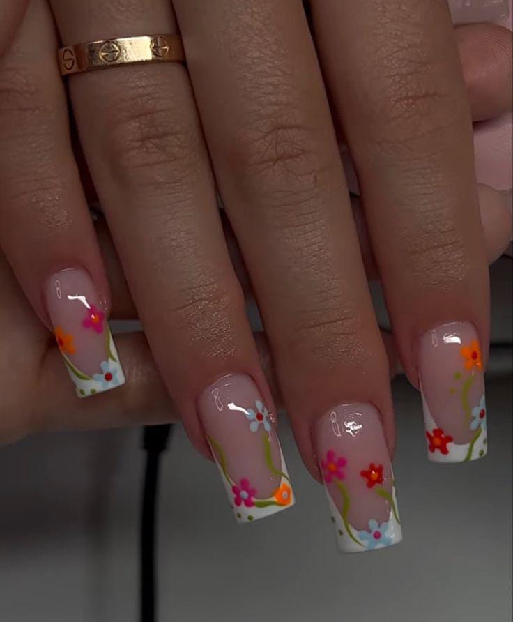These square French tips are decorated with tiny, vibrant flowers and dots over a nude base and white tips. The look feels playful, cheerful, and full of summer garden energy.