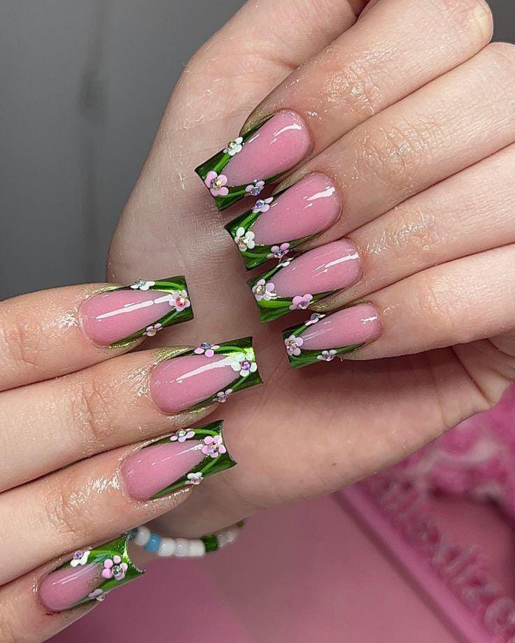 A soft pink base is paired with chrome green angled French tips and delicate raised floral with subtle embellishment accents. The style is cute yet feminine, giving off a fresh floral-meets-modern summer vibe.