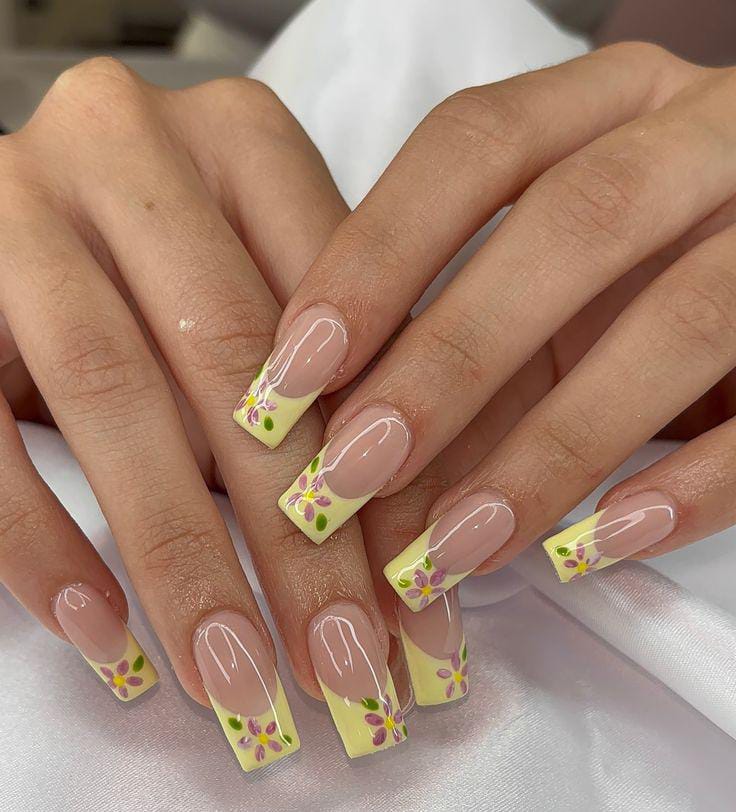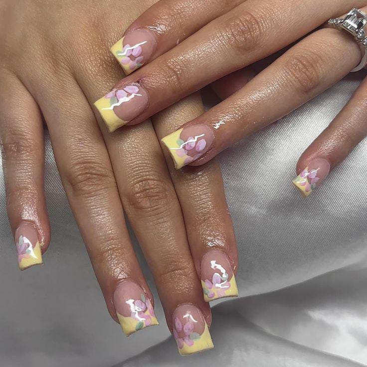 A soft nude and gentle pastel yellow French tip combined with floral art gives this design a soft summer garden-like charm. It feels fresh, cute, and lightly playful without being too bold.