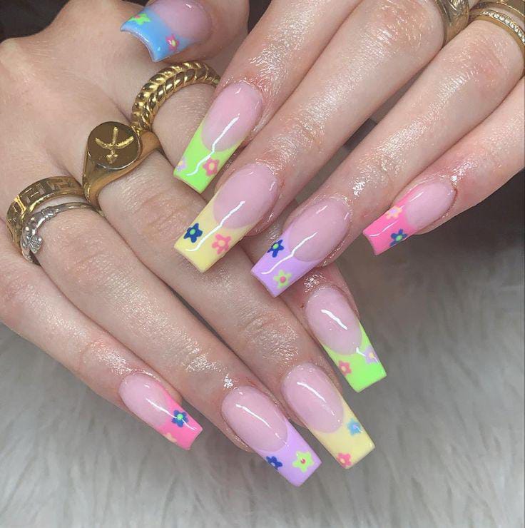 These long square natural nails feature colorful pastel French tips in shades of pink, green, yellow, purple, and blue. Tiny daisy accents add a playful, retro vibe that feels bright, cheerful, and perfect for summer.