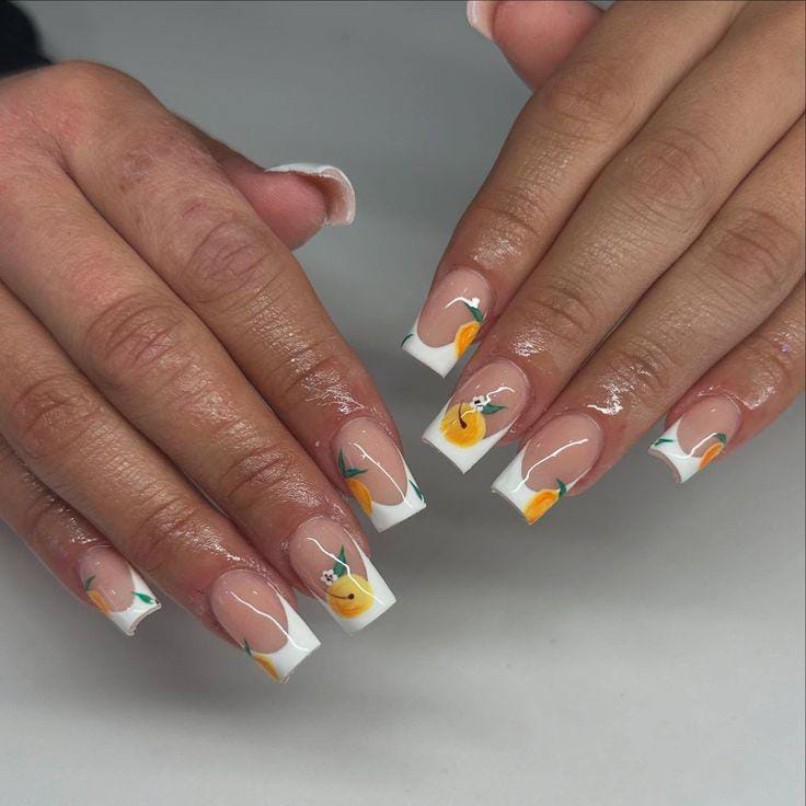 A classic white French tip gets a fresh summer twist with delicate orange fruit details. The glossy nude base keeps it clean and elegant, while the tiny citrus designs make it feel fun and sunny summer days.