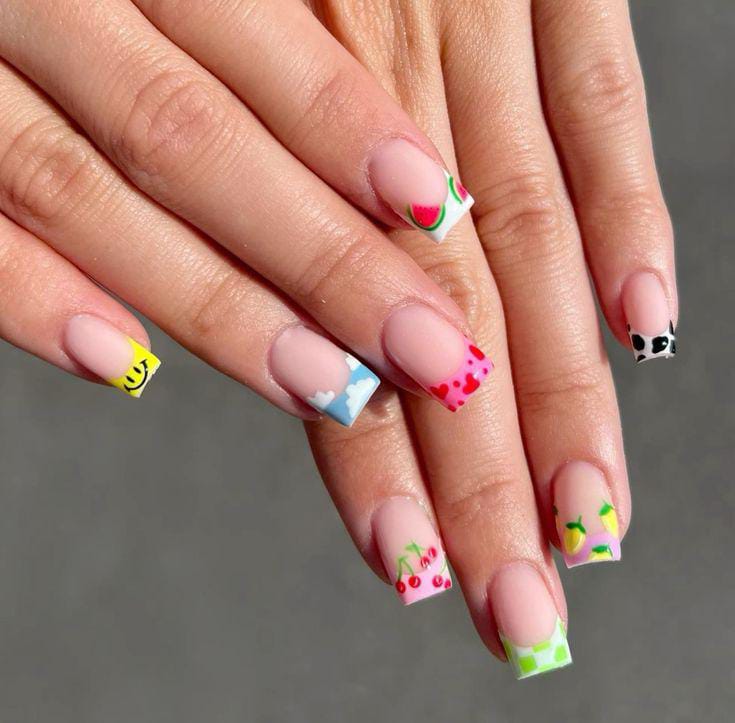 Each nail showcases a different colorful French tip design, from fruit and smiley faces to abstract patterns. The nude base balances the bold colors, giving it a trendy, cute, playful, and creative summer look.