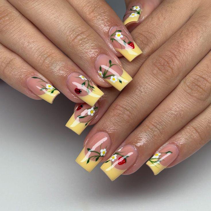 Nude pink base and soft yellow French tips are paired with delicate white flowers,branches, tiny ladybug and red fruit accents. The design feels fresh and feminine, with a sweet garden-inspired summer aesthetic.