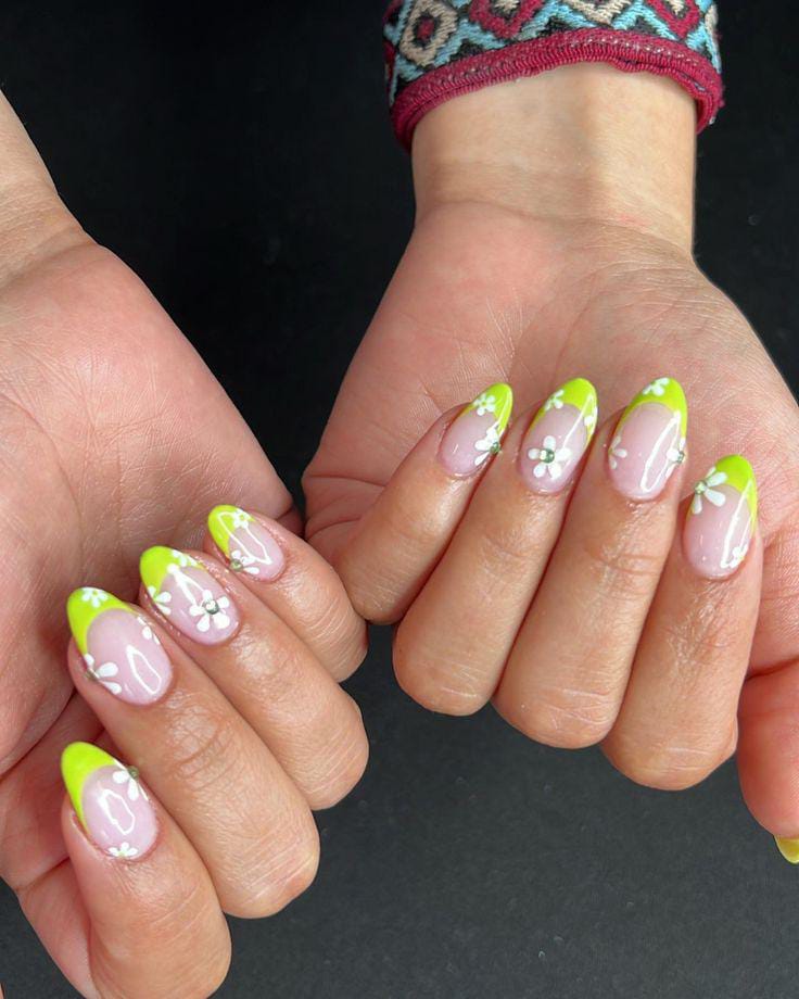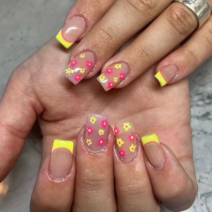 Bright neon yellow French tips pop against a natural base, while small pink and yellow flowers add a cute, youthful touch. The overall look is vibrant, glossy, and full of sunny summer energy.