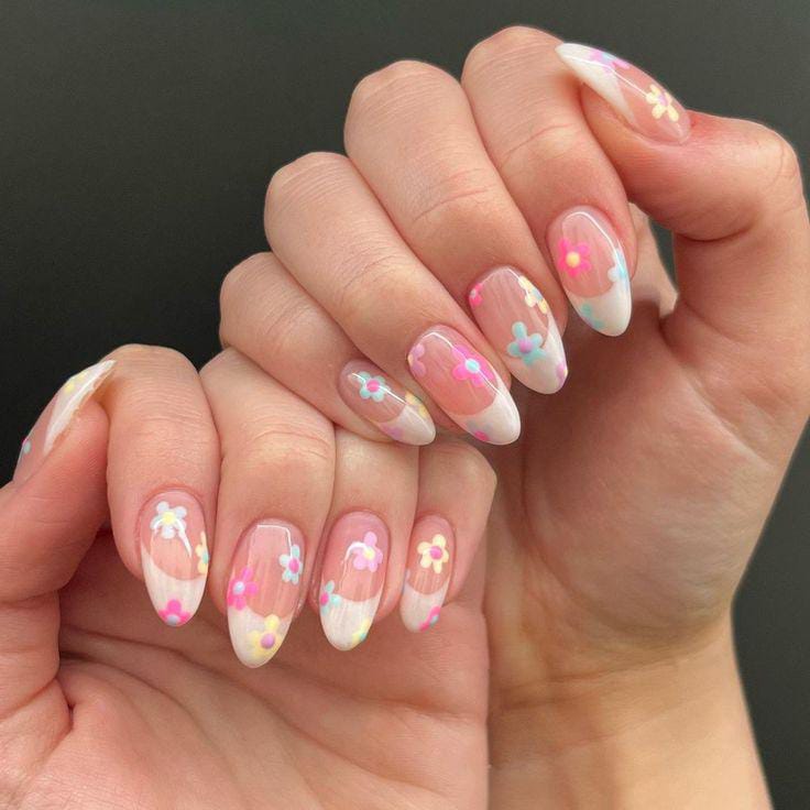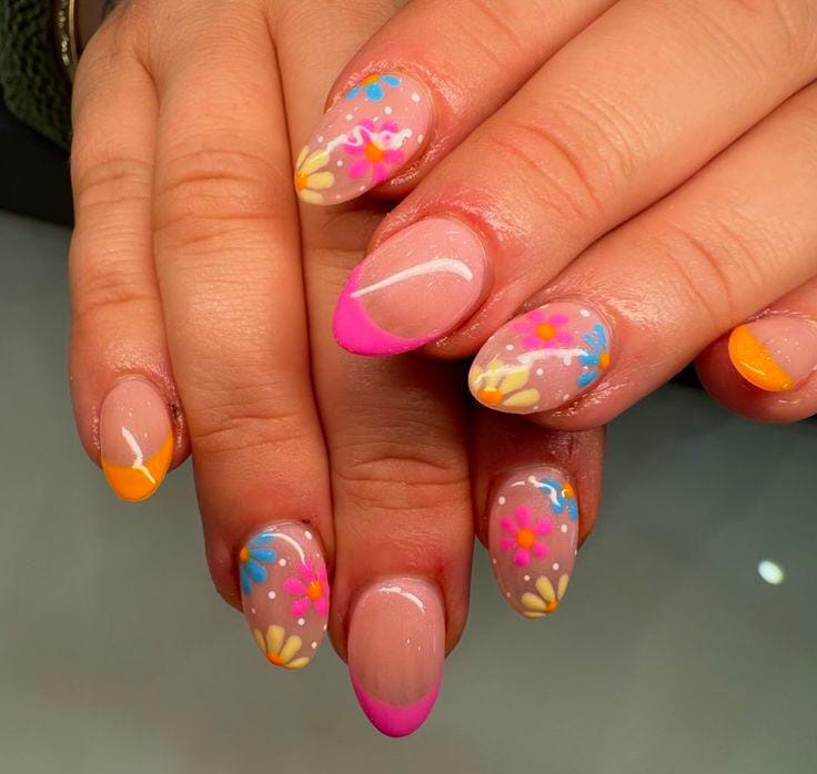 This soft nude style mixes colorful French tips with playful flower and dots art for a lively, artsy appearance. The warm tones and scattered floral patterns give it a hand-painted, carefree summer aesthetic full of personality.