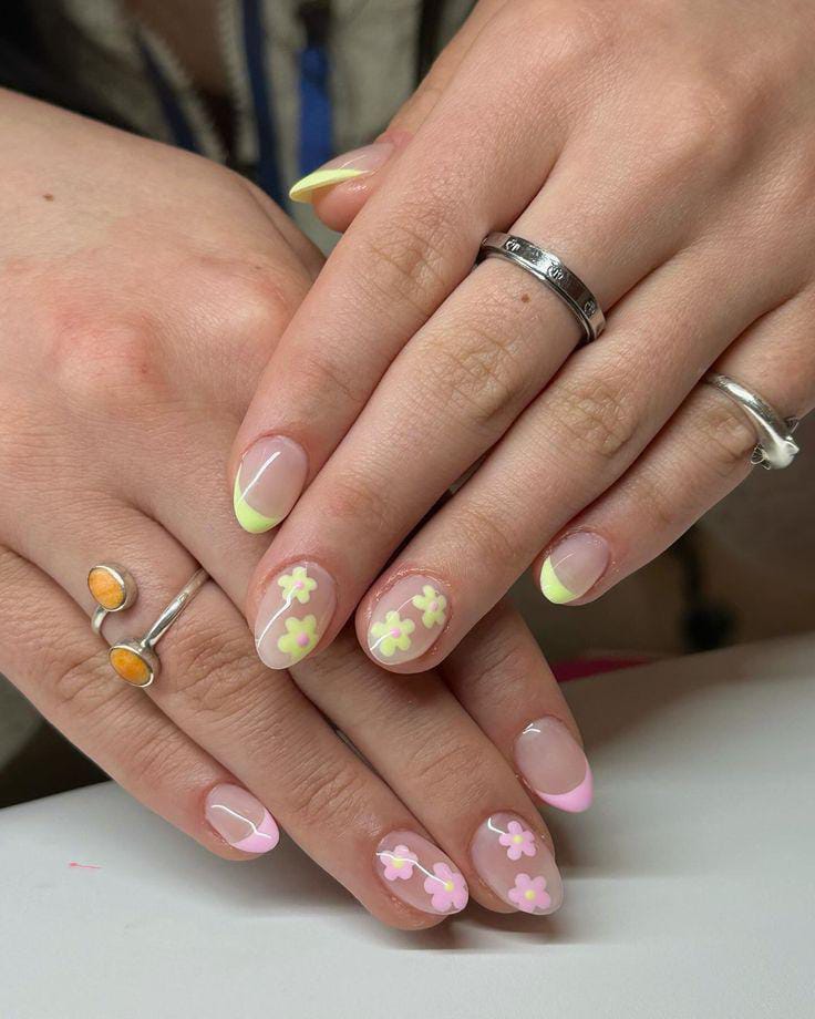 Each soft pink nail features a different pastel-colored French tip with tiny white daisies scattered on top. It’s cheerful, colorful, and gives off a cute, carefree summer mood.