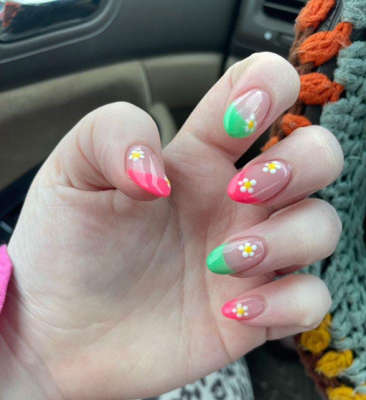 A nude pink base and bright neon pink and green French tips create a fun, energetic summer look. The little daisy details keep the design cheerful and girly, giving it a retro-inspired vibe that feels perfect for sunny days.