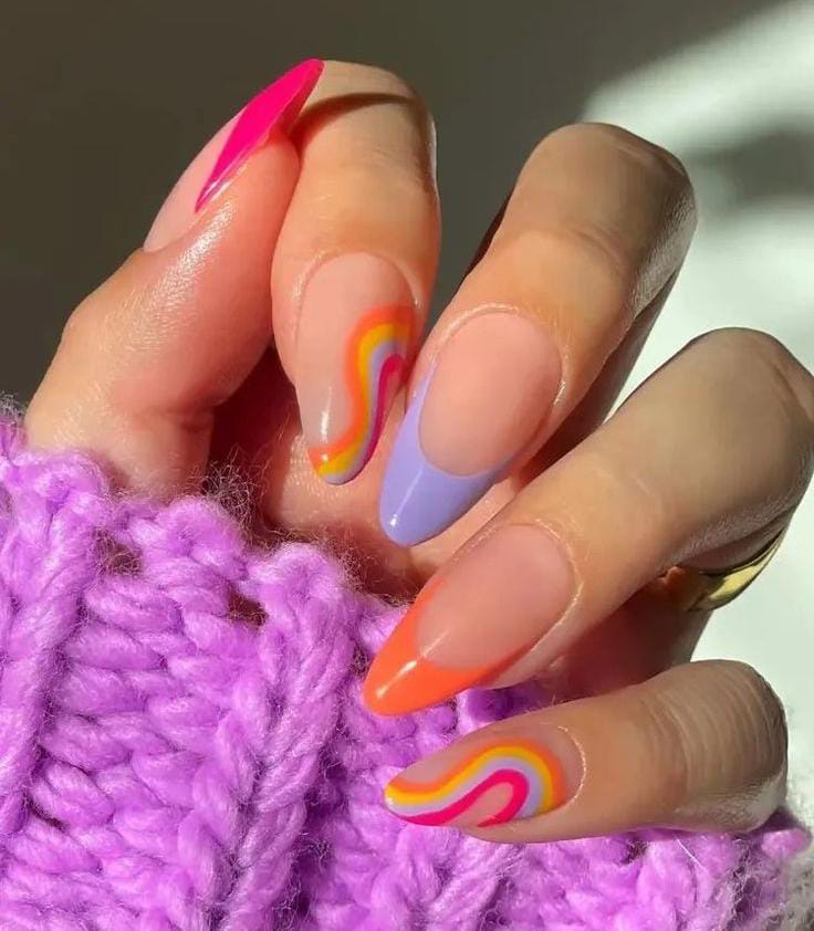 This design features bold, colorful tips with flowing swirl accents that feel very 70s-inspired. The combination of soft nude space and bright curved lines creates a trendy, cute, and slightly nostalgic summer mood.