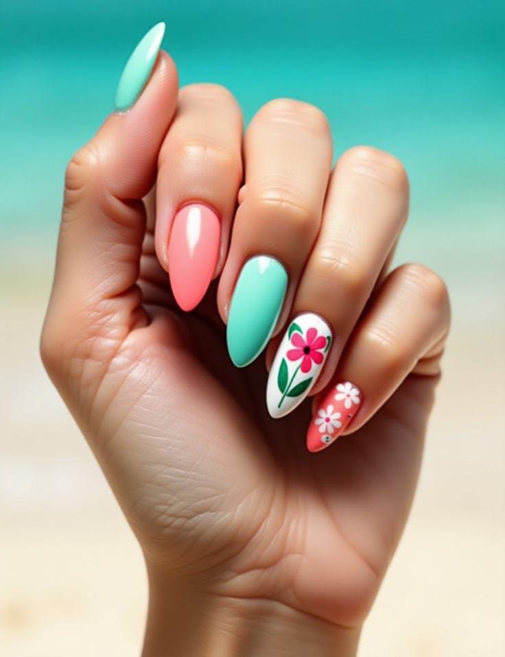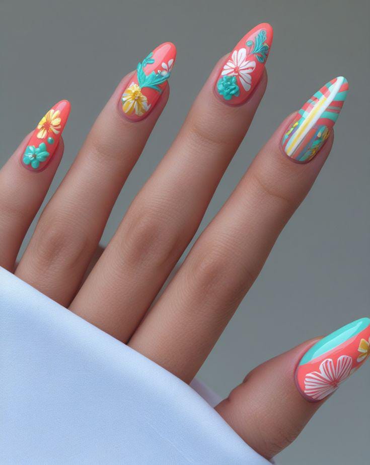 These nails feature soft coral bases with hand-painted floral accents in teal, yellow, and white. The overall vibe feels fresh, playful, and perfect for a sunny summer getaway.
