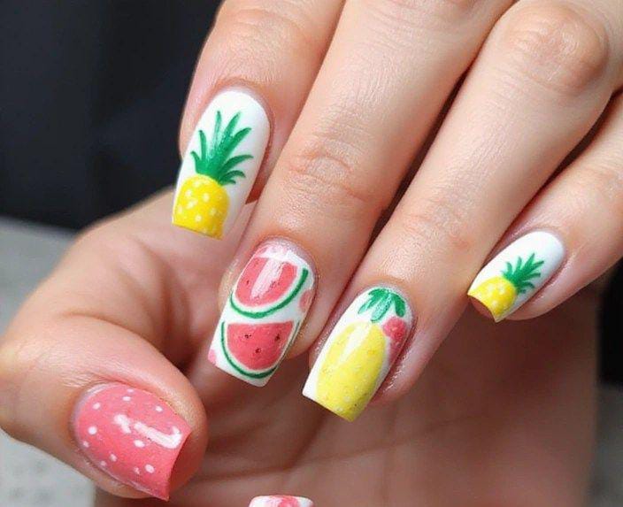 A playful design with bright fruit-inspired colors such as yellow pineapples and watermelon accents on white nails. It’s lively and ideal for those who love cute and fun, fruity summer vibes!