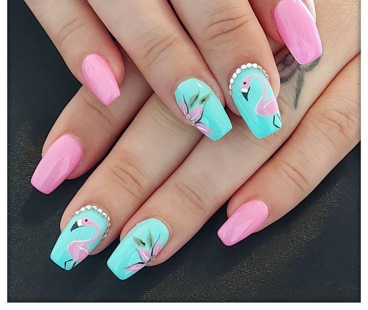 This design mixes soft pink and aqua tones with playful flamingo, floral and rhinestones accents for a fun, beachy feel. The glossy finish and simple artwork make it cute, fresh, and perfect for summer vacations.