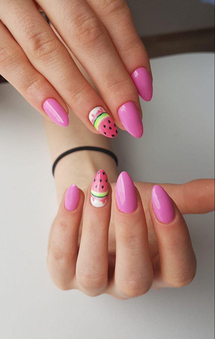Bright pink nails are paired with cute watermelon accents for a bold yet fun summer style. The mix of solid color and fruity cute art keeps the look fresh and youthful.