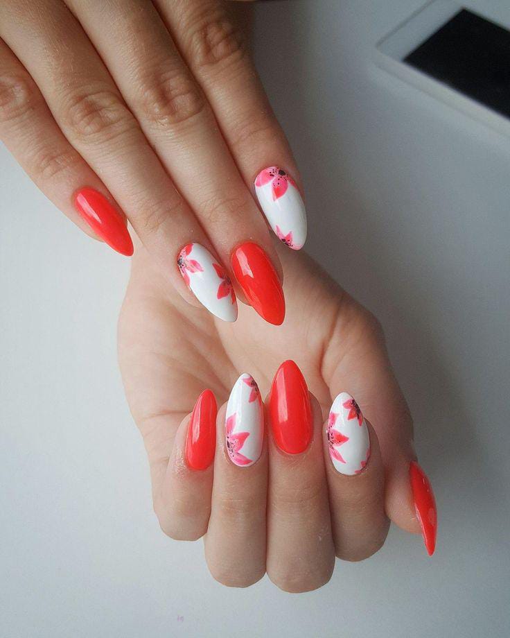 Vibrant coral-like orange and white nails combined with delicate floral details create a fresh and elegant summer look. The contrast between bold color and soft white accents feels warm and stylish.