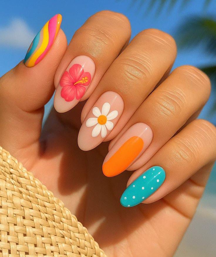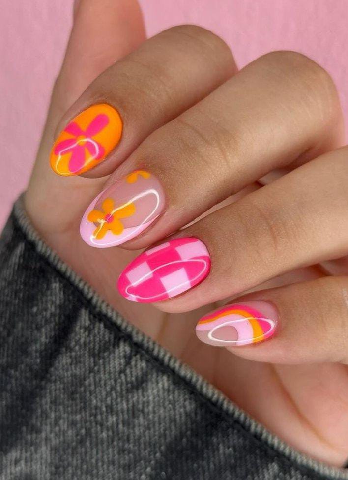 Bright pinks, oranges,yellows and nude tip nails come together in bold floral, swirls and abstract patterns. The design feels fun, retro, and full of cute summer energy.