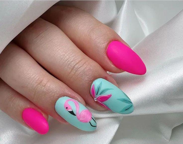 Hot pink and mint tones pair beautifully with delicate flamingo and leaf art. This design feels tropical, lighthearted, and perfect for summer vacation days.