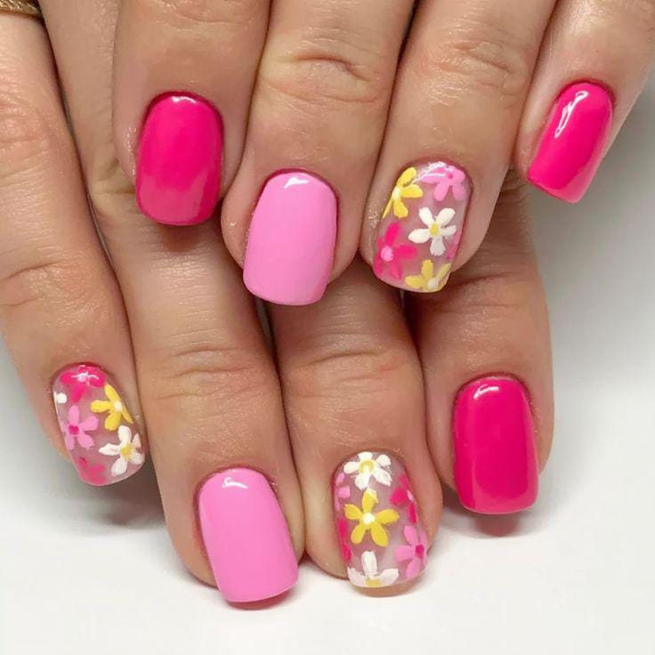 Pink and fuchsia nails are mixed with translucent floral accents for a soft, girly look. The flowers add a cute, fresh summer touch without feeling too busy.