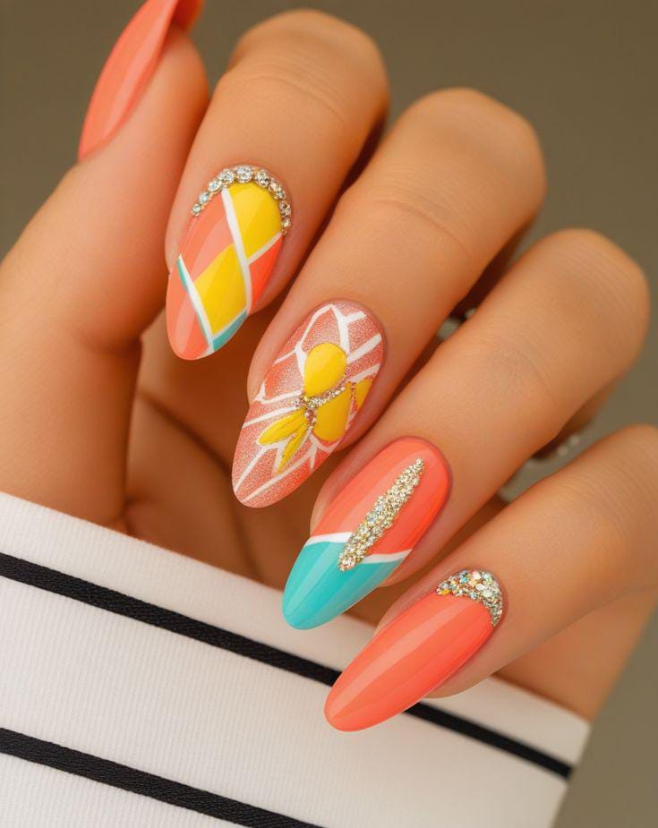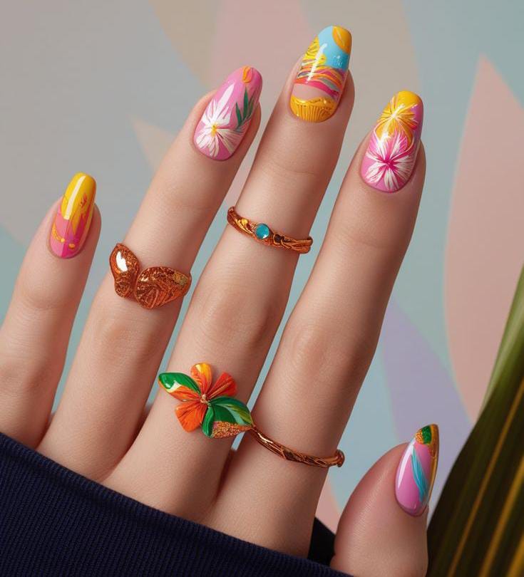 A bright mix of pinks, yellows, and aqua creates a warm sunset-inspired look with floral details. The design feels bold yet cheerful, giving major summer vacation energy.