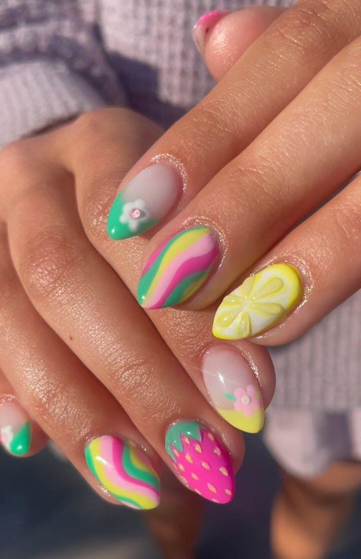 Each nail features soft pastel shades inspired by different fruits like orange, lemon, pink and lime. The look is cute, airy, and perfect for a light summer aesthetic.