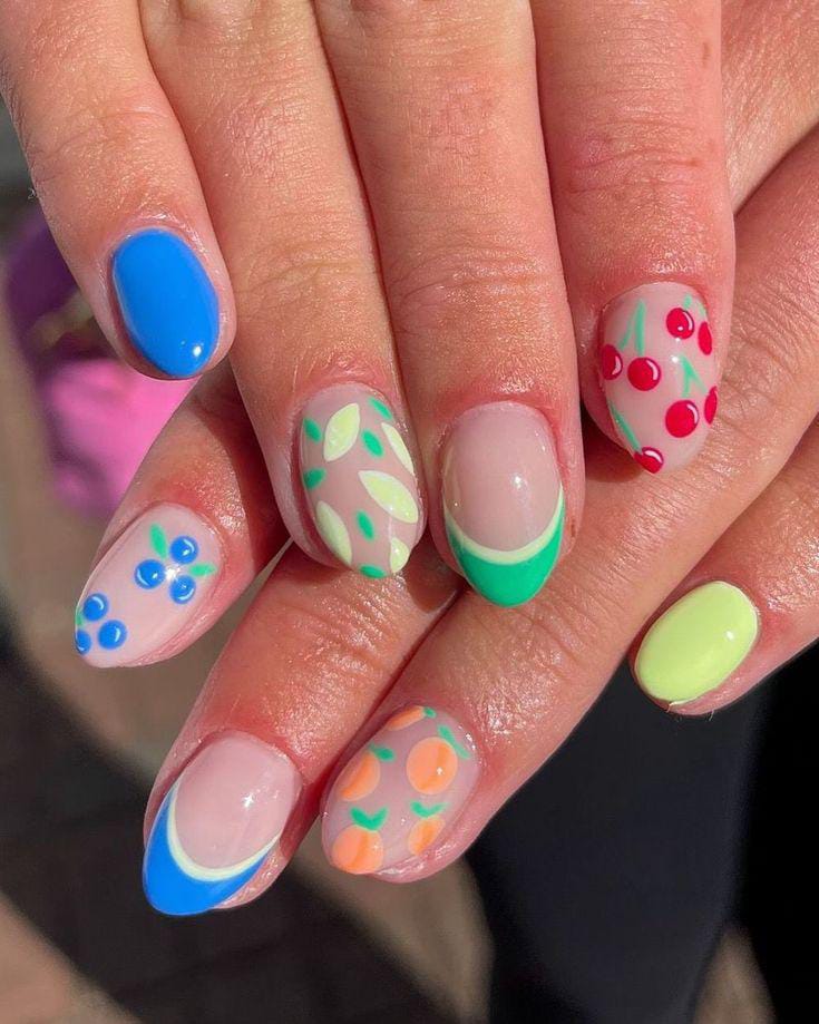 A fun, colorful manicure with a mix of bright blues, greens, and soft french tip nails paired with tiny fruit patterns. The overall vibe is playful, artsy, and perfect for a cheerful summer look.