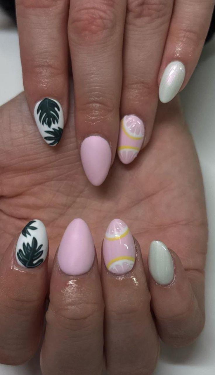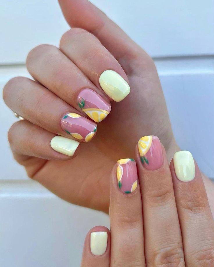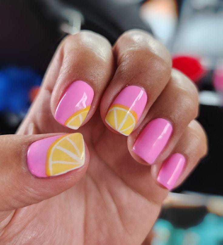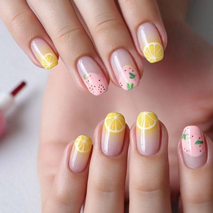 Soft pink and nude shades are mixed with cheerful yellow lemon tip accents. Subtle black dots and green details. This design feels light, cute, and perfect for sunny summer days