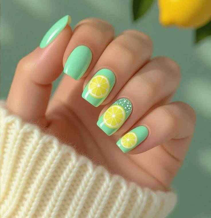 Cool mint green nails paired with lemon slice subtle dots accents create a crisp and refreshing style. The design feels cute, modern, and effortlessly summery.