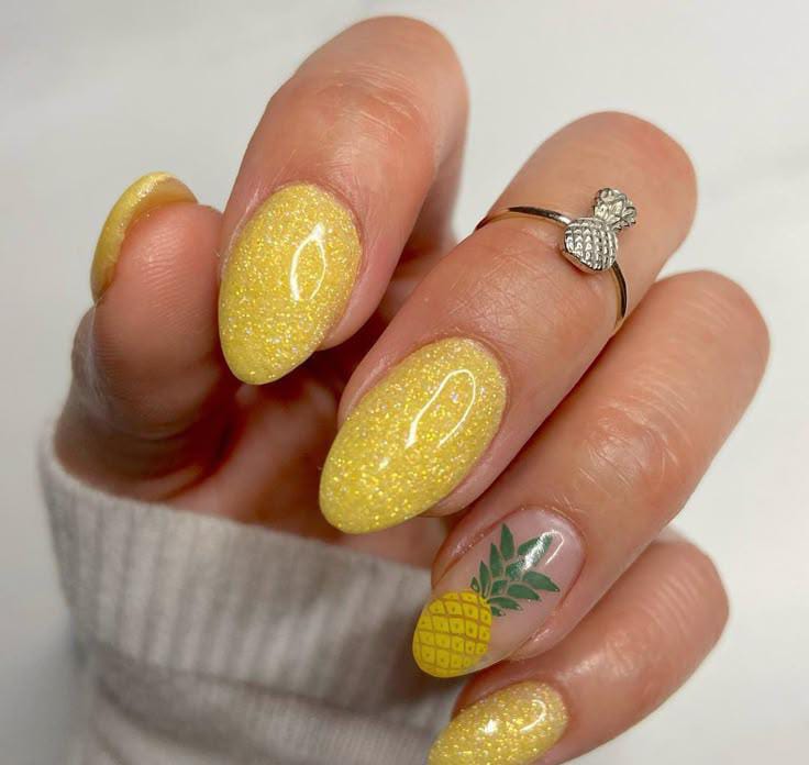 Shimmery yellow nails steal the show with a cute pineapple accent for a tropical twist. The vibe is bright, bold, and perfect for beachy summer days.