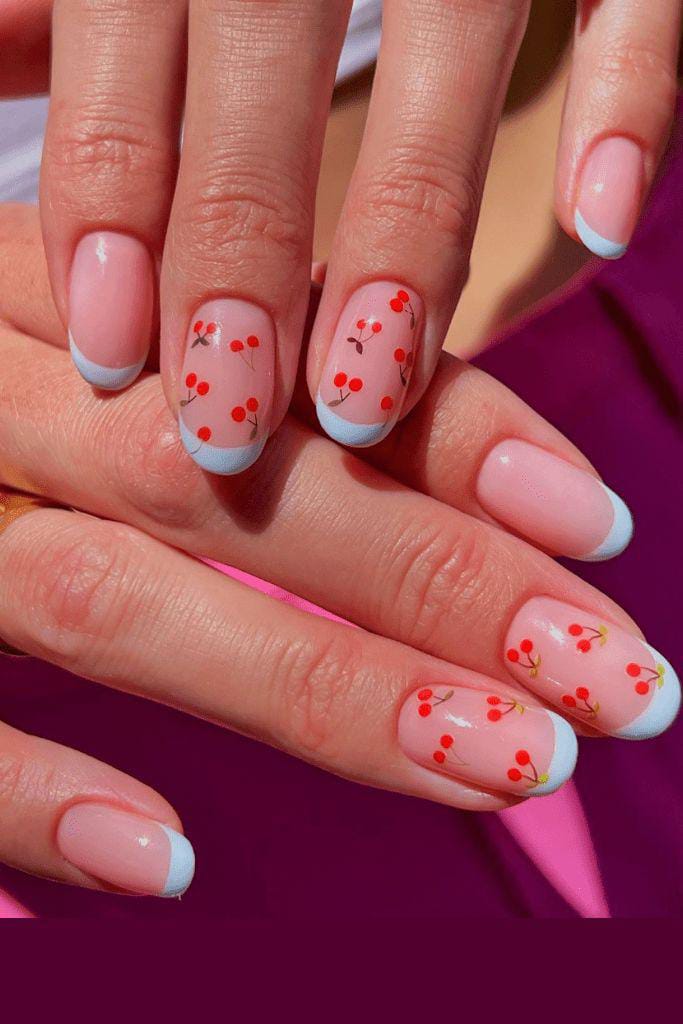 A soft pink base with classic blue French tips is elevated by tiny cherry designs. This manicure feels cute, feminine, and subtly playful for summer.